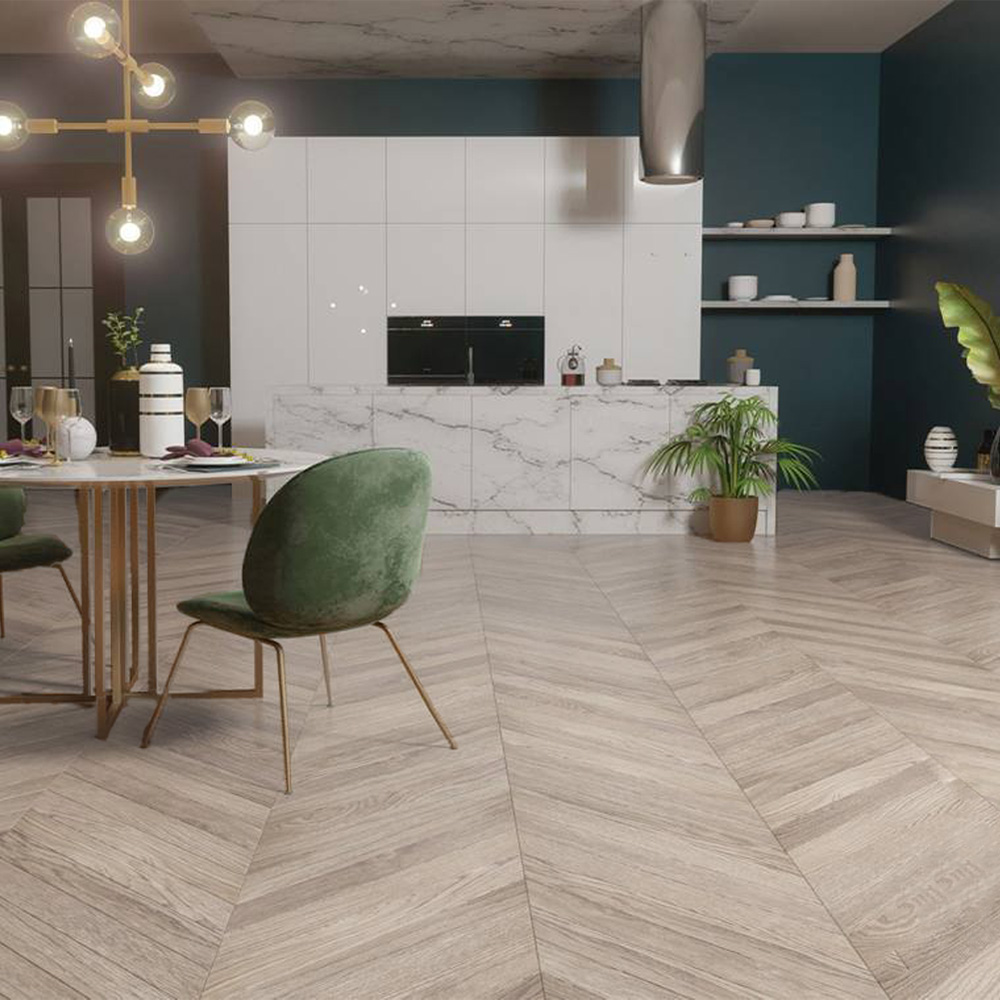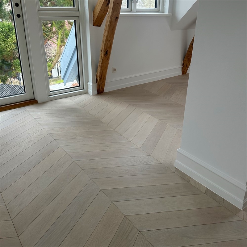 Chevron er en klassisk parketstil, hvor træstave er skåret i en vinkel på 45 grader, hvilket skaber et harmonisk og symmetrisk mønster. Denne præcision giver det et ensartet og strømlinet udseende, der skiller sig ud i forhold til andre parketdesigns som sildeben, der krydser hinanden.